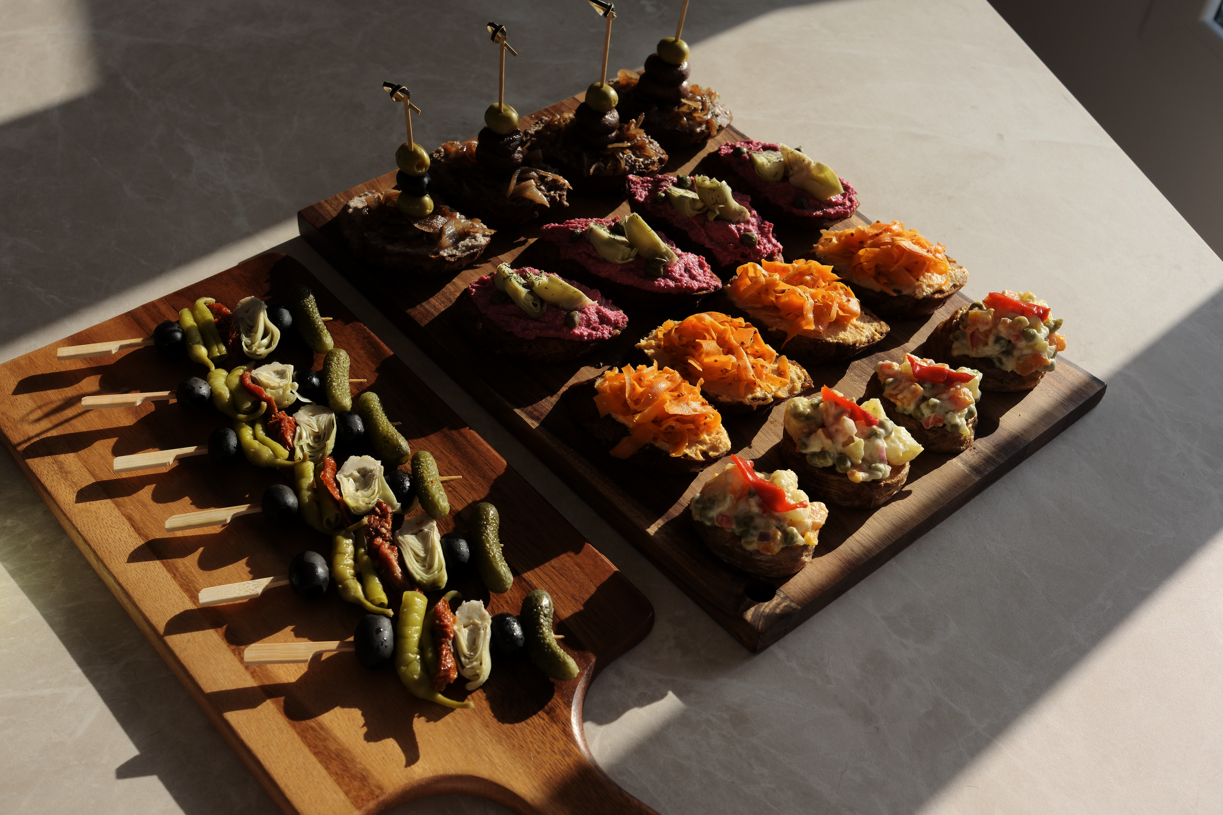 Nuestra ensaladilla vegana con piparra y aceituna.