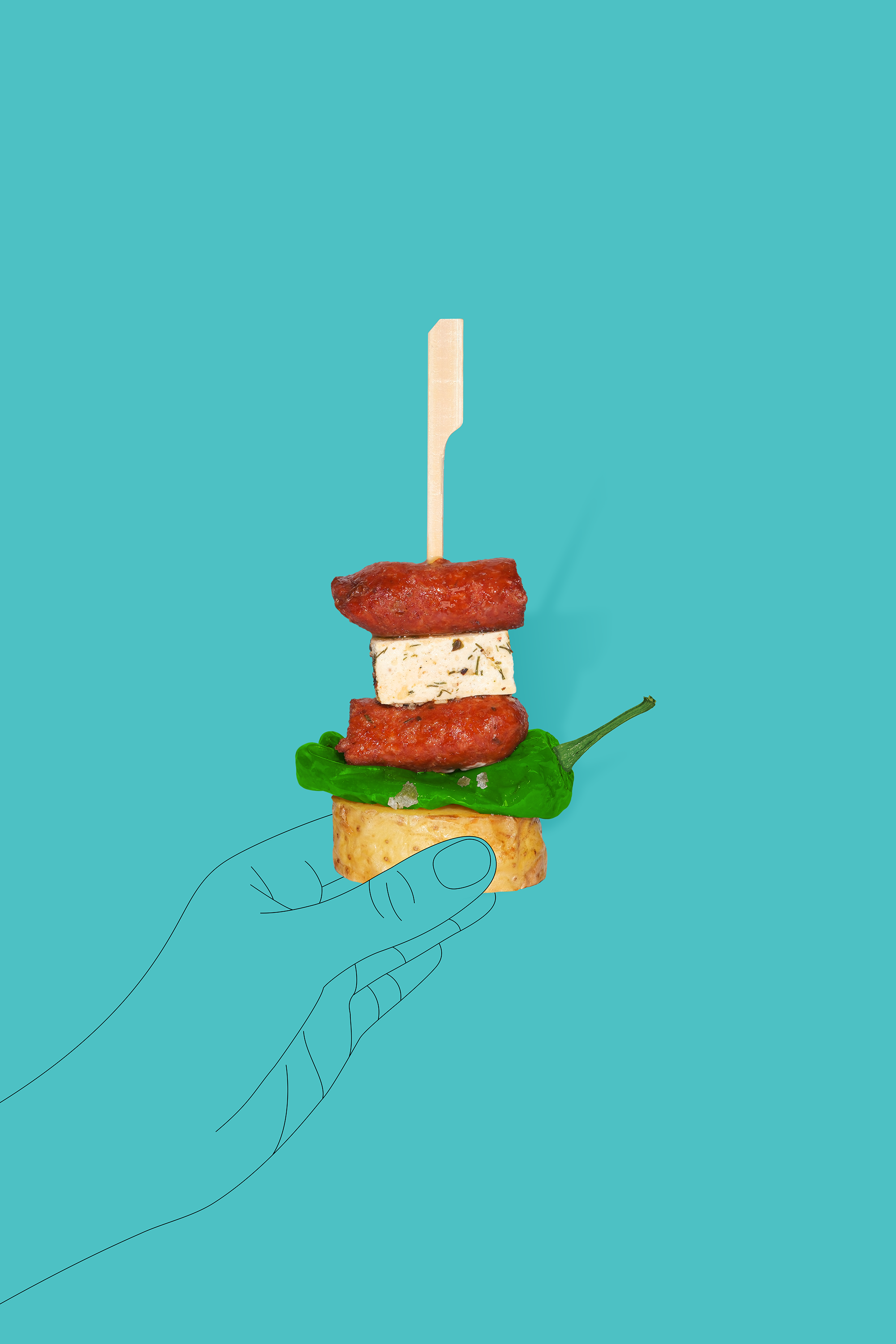 Brocheta de piparra, pimiento, aceituna y tofu marinado.